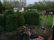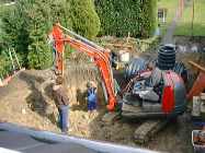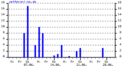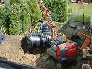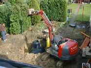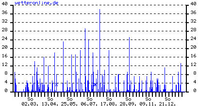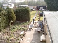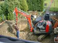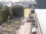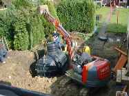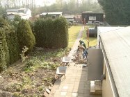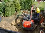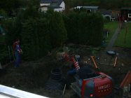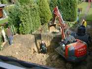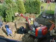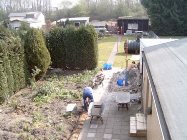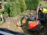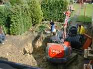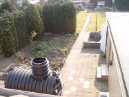 FiltertechnikDer starke Regen in Düsseldorf am 4.Juli 2009 und der starke Regen am 19.Juli 2009 reinigten den Wechselsprungfilter nicht selbstständig, was eigentlich der Sinn eines Filters mit Selbstreinigungseffekt ist.Die hintere Dachfläche vom Haus ist angeschlossen und der Anbau mit dem Dachpappendach: Man erkennt das der Filter mit Blütenstaub und Steinen verstopft ist: Hier sieht man den Anschluss der Düse von der Seite und das Modell des Filters: Nun ist die Spülung aktiv und der Strahl trifft den Filter, der Rand wird nicht vom Spülstrahl erfasst. Erst nach der mechanischen Reinigung mit dem Besen ist das Sieb sauber gewesen das das Wasser nicht mehr an der flachen Stelle stehen bleibt: Niederschlag in DüsseldorfNiederschlag mm 01.02.2006 - 31.01.2007![]() Niederschlag mm 01.02.2007 - 31.01.2008![]() Niederschlag mm 02.02.2008 - 31.01.2009![]() Niederschlag mm 02.06.2009 - 30.06.2009![]() RegenwassernutzungDurch einen Rohrbruch in der Abwasserleitung im Jahr 2002 musste ich ca. 1,5m Abflussrohr mit Hilfe meiner Freundin austauschen.In diesem Zuge reinigte ich die restlichen 20m bis zum Straßenkanal, dabei versperrten teilweise Wurzeln den Weg. Es war also was im Rohr oder im Busch. Eine Tanne hatte mit Ihren Wurzeln die Abwasserrohre aus Ton an den Muffen beschädigt. Also stand fest, das Rohr muss ausgetauscht werden. Also wurde das mit Hilfe von vielen Freunden durchgezogen. Tag 0 01.04.2004:Die Zisterne wird geliefert. Hmm ist größer als die Garage. Maik und Rainer sind so nett und tragen die hinter in den Garten.(Bild) Tag 1 (Freitag) 02.04.2004:Es wurde das alte Fischbecken mit 3 Stemmhämmer abgerissen und der Schutt in einen 7cbm Container auf der Straße gefahren. Die Platten des Hofes wurden von einem Kleingärtner abgeholt, dieser holte später auch ausgehobenen Schlamm aus der alten 3-Kammer Sickergrube. Nachdem die Platten und das Fischbecken weg war, waren ca. 7 Tonnen!!! Schutt bewegt worden. Es wurden Flaschen von alkoholischen Getränken und von Parfüm gefunden, diese wurden als Dekoration aufgehoben. Das Fischbecken wurde wieder mit Erde oder Lehm verfüllt und verdichtet. Die Baumschienen-Leihfirma brachte dann auch, nachdem ich mehrmals nachgefragt habe, den Bagger und den motorbetriebenen Stampfer. Das Fahrerhaus musste demontiert werden, damit der auch durch die Garage passte. Tag 2 (Samstag) 03.04.2004:Frühmorgens baggerten nacheinander verschiedene Baggerführer die alten Abflussleitungen aus und erstellten einen neuen Schacht für die neuen Rohre gemäß meinem vorher gezeichneten Plan. Da es zwei Punktentwässerungen (eine Fläche wird von allen Seiten auf einen Punkt hin entwässert) geben sollte, mussten die Leitungen neue Wege gehen/fließen. Als die Rohre und der Anschluss für den Überlauf der Regenwasserzisterne im Sandbett verlegt waren, wurde die Erde per Stampfer verdichtet, so dass der Bagger wieder fahren konnte. Die alte Sickergrube wollte ich ursprünglich komplett entfernen lassen, was sich aber als großer Arbeitsaufwand darstellte, da der "Blaubeton" sich als schwierig rausstellte. So wurde also nur das Nötigste weggestemmt. Beim Erstellen der ca. 2,5m tiefen Grube für die 3000l Zisterne, stießen wir wieder auf ein neues Problem. Ich wollte ursprünglich die Zisterne parallel zum Anbau aufstellen. Nun stießen wir ca. 1,5m unter dem Boden auf etwas Ungewöhnliches. Zwei Rohre zeigten sich in dem Boden, leicht gebogen auf einem Deckel aus Stahl und Beton. Nachdem wir ein Loch in den Deckel geschlagen hatten, stellte sich zum Glück nicht die erste Vermutung ein, dass es ein alter Öltank sei. Es war ein Brunnen, so alt, dass meine Mutter ihn nicht einmal kannte, das heißt das Baujahr muss vor 1970 gewesen sein, denn meine Oma hat so etwas nie erzählt. Wir wollten wissen wie tief der Brunnen ist und ich steckte einen Zollstock rein, mehr als zwei Meter, also nochmal ein Holz dran gebunden, ca. 3,5m plus 1,5m von der Geländehöhe. Ganz schön tief, wir schütten diesen zu mit der Erde, die wir noch übrig hatten, eine Saugarmatur ist noch gerettet worden und liegt nun im Garten als Anschauungsobjekt. Das Ausrichten der Zisterne gestaltete sich leicht schwierig und nahm mehr Zeit in Anspruch als geplant, die Leerrohre und das Zulaufrohr von der hinteren Dachfläche wurde angeschlossen. Eine Kernbohrung verhalf dem Leerrohr Zugang zum Keller. Tag 3 (Sonntag)04.04.2004:"Blaubeton"Wie ich an meinen Log-Dateien sehen kann ist dies ein oft gesuchter Begriff.Die Herkunft dieses Begriffes ist mir nicht bekannt und ich kann das nur versuchen abzuleiten. Der Beton hat seinen Namen wohl von seiner Farbe, was nicht anders zu erwarten war, er schimmert blau, die Oberfläche ist glatt. Beim Abstemmen von diesem Beton ist der Anteil an Kiesel im Vergleich zum Beton relativ gering. Bewehrungsstahl oder auch früher Moniereisen genannt (recherschiere doch mal selbst nach Joseph Monier). Dieses macht das Stemmen nicht wirklich einfach. Die Eigenschaften sind weiterhin, dass er wasserdicht ist und auch gegen kalkhaltige Wässer bestehen muss.