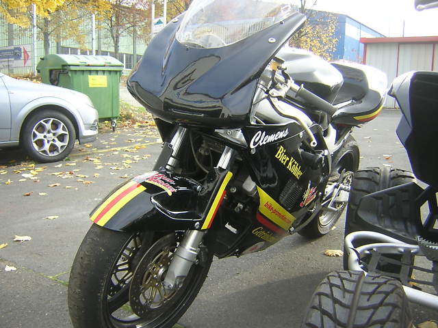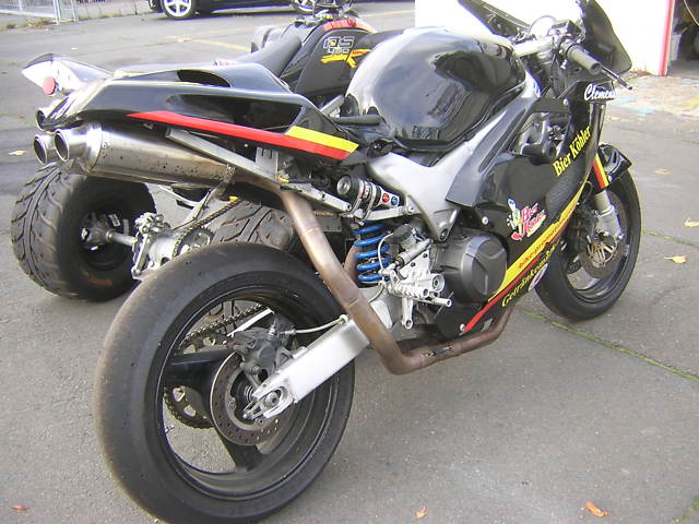 Nachrüstung 02.2006 mit Wilbers Federbein, schraubarer Höhenverstellung, Dynojetkit aufgrund von Aufsetzen während Kurvefahrten mit der Verkleidung. Honda VTR 1000Honda VTR1000 mit Ducati VerkleidungType : VTR 1000 Erstzul. : 2002 Leistung : ca.100 PS Hubraum : 996cm³ Leergewicht : 218 kg Zul. Gesamtgewicht : 406 kg Höchstgeschwindigkeit: 241 km/h? Änderung : Diverses