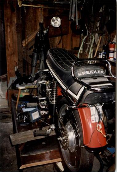Kreidler RSKreidler RS50 mit VollverkleidungType : RS Erstzul. : 1980 Leistung : 6,25 Hubraum : 49cm³ Leergewicht : 81 kg Zul. Gesamtgewicht : 245 kg Höchstgeschwindigkeit: 40 km/h Vergaser Bing : 1/14/99 Kettenritzel : 12 Zähne Kettenrad : 36 Zähne Einzige Änderung : ein Rennauspuff, der Original ist nicht dabei gewesen.
